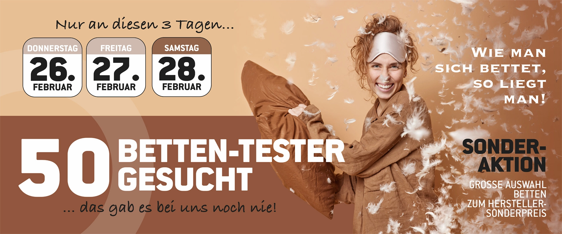 Nur vom 26.–28. Februar 2026 hast du die Chance, Betten-Tester bei Pfiff Möbel zu werden.